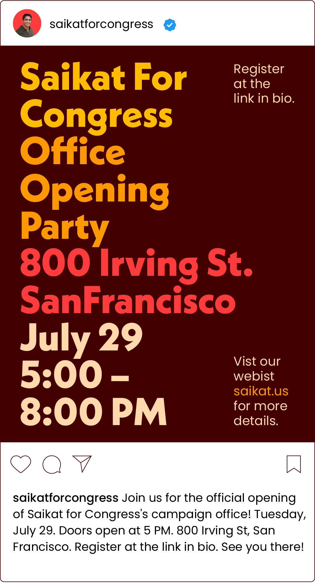Proposed graphics for campaign events. I’ve provided a range of directions, based on the look and feel of the Saikat for Congress website.